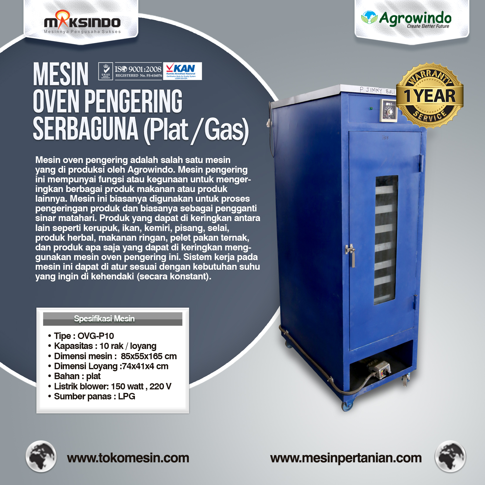 Mesin Oven Pengering Gas Multiguna merupakan mesin yang kegunaannya sebagai pengering berbagai macam produk makanan maupun produk lain. Mesin ini memiliki fungsi sebagai pengganti dari sinar matahari dalam proses pengeringan pada suatu produk dengan suhu yang dapat diatur secara tetap atau yang dikehendaki. Mesin ini biasa digunakan untuk pengeringan produk seperti ikan, kerupuk, kemiri, selai pisang, makanan ringan, dan lain-lain.