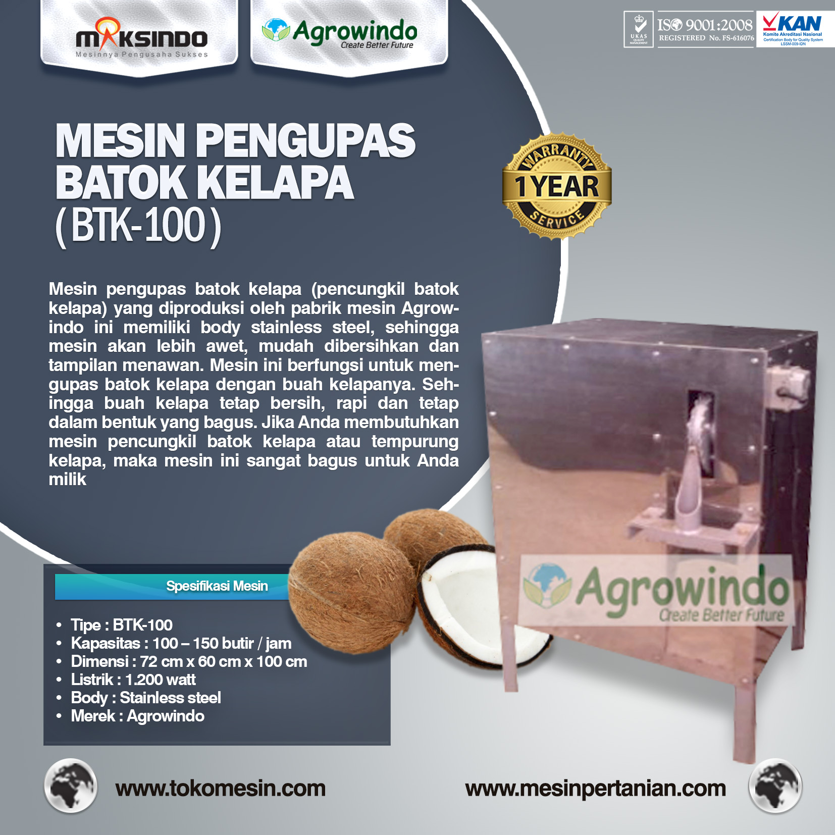Mesin pengupas batok kelapa yang tersedia di toko mesin maksindo makassar mempunyai tipe dengan nama BTK-100. Pada proses pengupasan batok kelapa dengan mesin ini mampu menghasilkan hasil kupasan batok kelapa sebanyak 100 hingga 150 butir kelapa dalam waktu setiap jamnya. Mesin pengupas batok kelapa tipe ini memiliki luas ukuran dimensi dengan panjang 65 cm, lebarnya 60 cm, dan untuk tingginya sendiri yaitu 100 cm. Mesin ini dibuat dari bahan staniless steel. Untuk sistim kinerja mesin ini menggunakan tenaga listrik dengan membutuhkan daya asumsi sebesar 1.100 watt. Mesin pengupas batok kelapa ini di produksi oleh pabrik Agrowindo. Kegunaannya mesin ini dibuat yaitu untuk mempermudahkan Anda alam proses pengupasan batok kelapa. Dengan mengaplikasikan mesin pengupas batok kelapa ini, maka Anda tak perlu kesulitan lagi atau repot dalam hal mengupas batok kelapa. Hasil kupasan pun juga terkupas dengan sempurna tanpa membuat kelapa pecah.