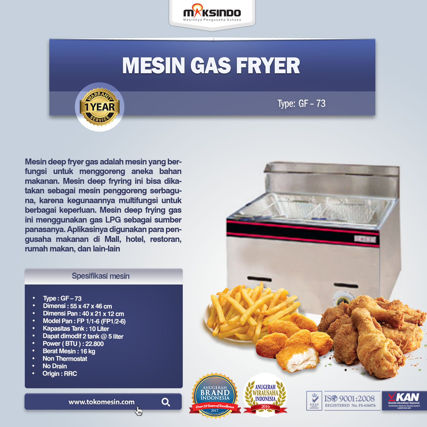 Mesin Deep Fryer Gas merupakan mesin yang digunakan sebagai penggoreng berbagai macam makanan. Mesin ini memudahkan Anda dalam proses penggorengan. Mesin deep fryer ini memiliki fungsi untuk menggoreng berbagai aneka makanan. Mesin ini dapat dibilang mesin sebagai penggoreng serbaguna. Mesin deep fryer gas ini sangat cocok dipakai di usaha restoran, hotel, pengusaha makanan, rumah makan, catering dan lain-lain.