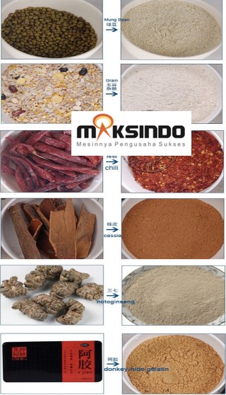 - Mesin gampang menggiling dan menepungkan bermacam bahan biji-bijian kering, bumbu kering, dan herbal