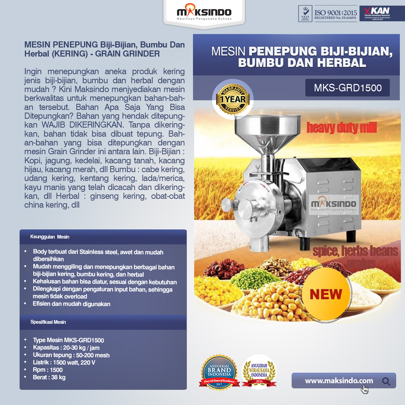 Mesin grain grinder termasuk salah satu mesin dari Maksindo yang mempunyai fungsi untuk menepungkan biji-bijian, bumbu dan juga herbal. Bahan yang akan ditepungkan dengan mengimplikasikan mesin ini yaitu bahan yang harus dikeringkan terlebih dahulu. Jenis bahan yang dapat Anda tepungkan dengan menggunakan mesin ini diantaranya yaitu : kacang tanah, jagung, kopi, kacang hijau, kedelai, kacang merah, cabe kering, udang kering, kentang kering, lada/merica, kayu manis yang sudah dicacah dan dikeringkan.