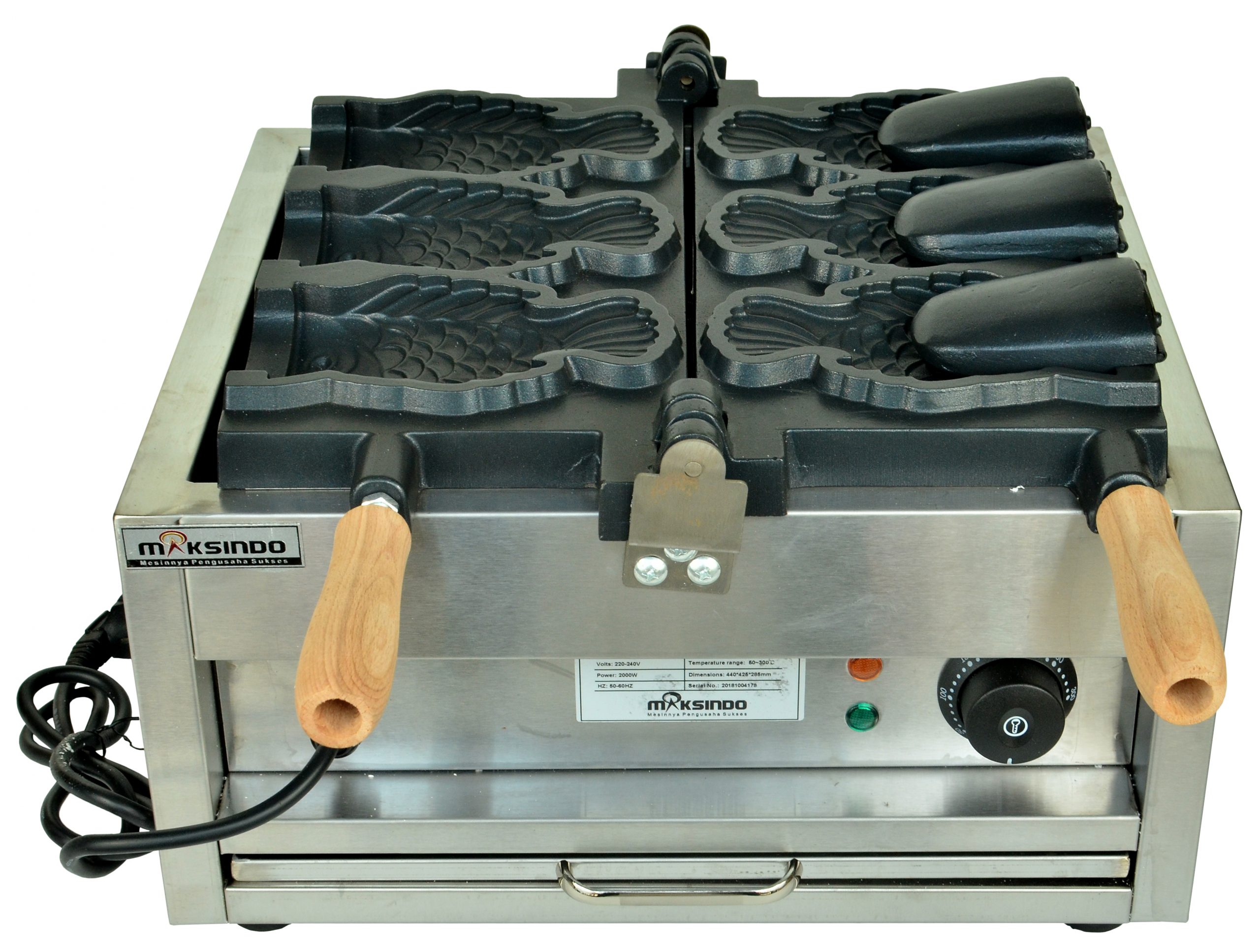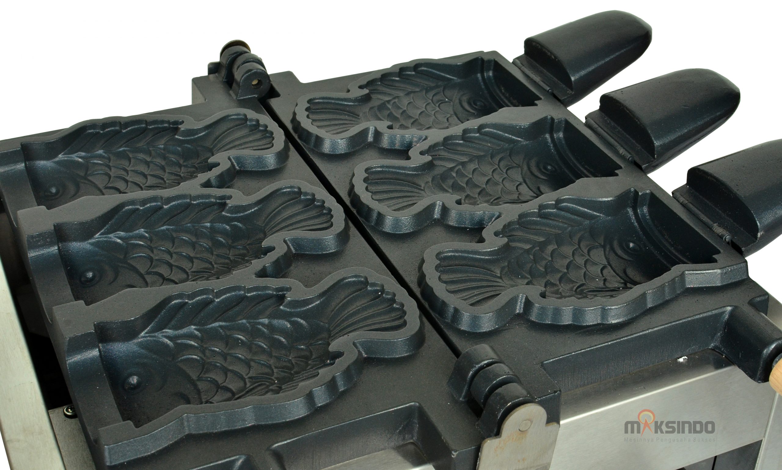Maksindo menyediakan mesin pembuat taiyaki waffle dengan mulut ikan terbuka (open mouth). Mesin ini terdiri dari 3 buah cetakan dalam satu mesin. Mulut ikan yang terbuka ini bisa Anda isi dengan es krim atau yang lainnya. Jadi jika Anda bisnis es krim, maka mesin ini layak Anda miliki