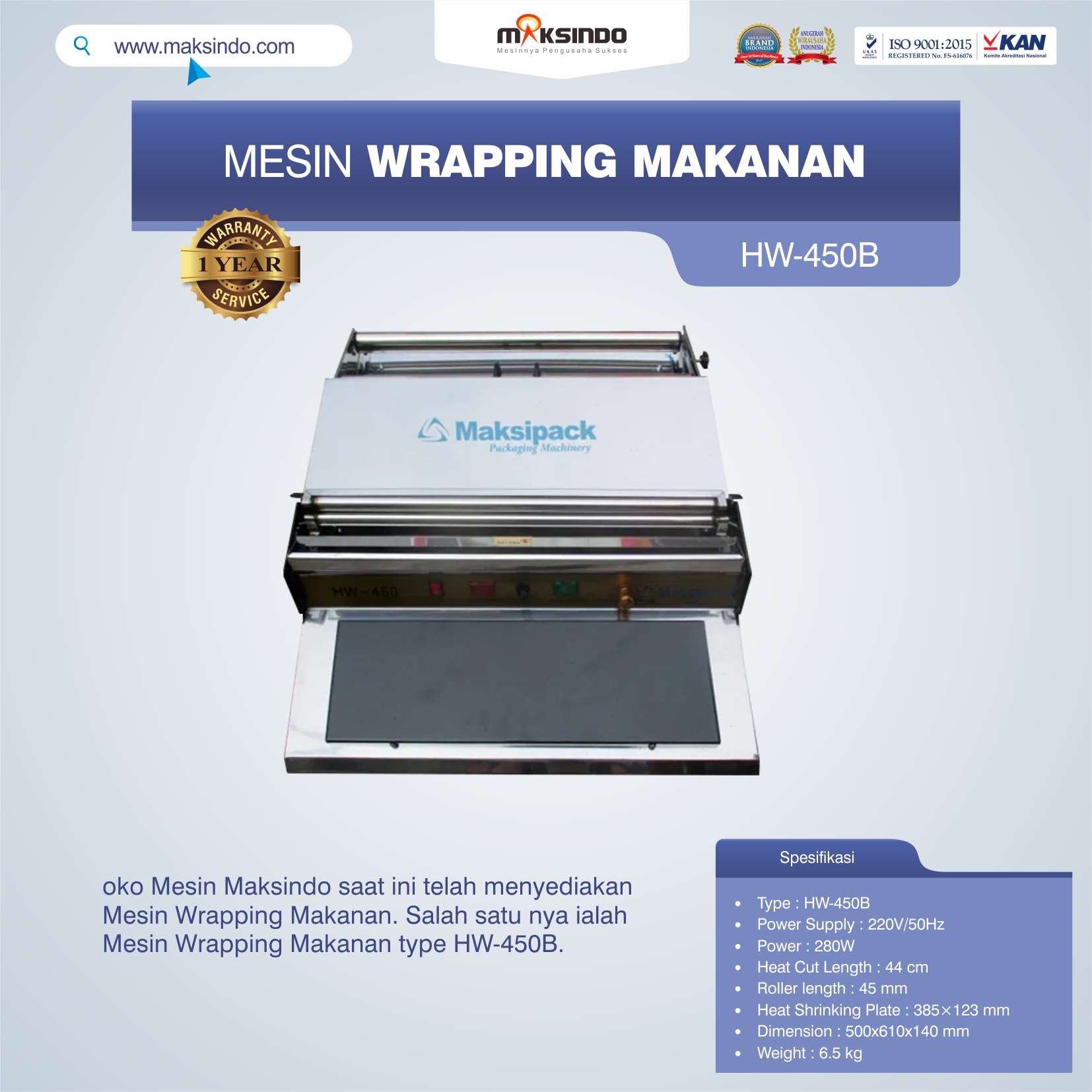 Toko Mesin Maksindo saat ini telah menyediakan Mesin Wrapping Makanan. Salah satu nya ialah Mesin Wrapping Makanan type HW-450B.