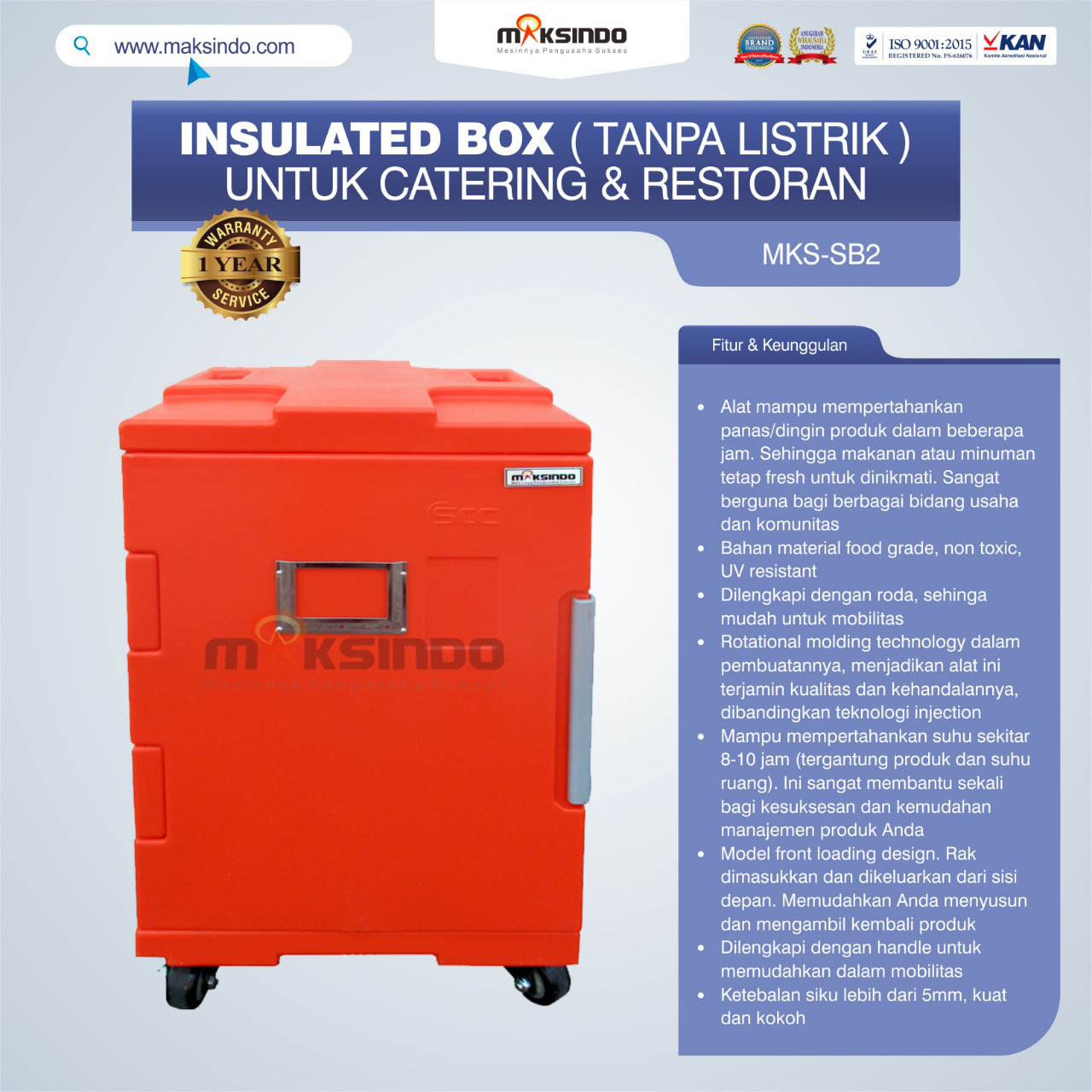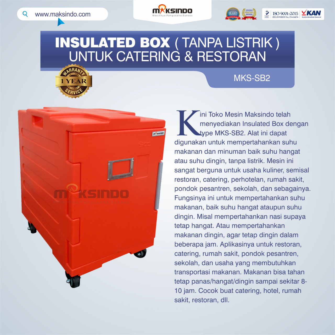 Kini Toko Mesin Maksindo telah menyediakan Insulated Box dengan type MKS-SB2. Alat ini dapat digunakan untuk mempertahankan suhu makanan dan minuman , baik suhu hangat atau suhu dingin, tanpa listrik. Mesin ini sangat berguna untuk usaha kuliner, semisal restoran, catering, perhotelan, rumah sakit, pondok pesantren, sekolah, dan sebagainya